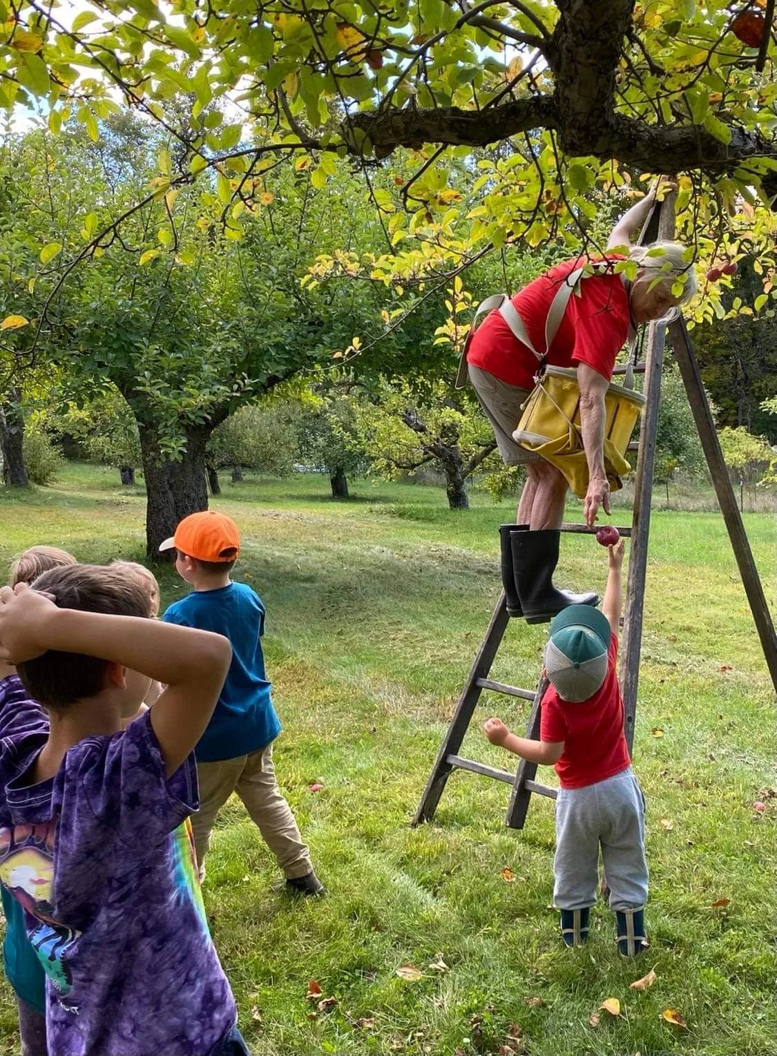 10 amFarmer Emma welcomes young friends for an orchard tour and story, a visit to the chickens, cider pressing demonstration, and a cup of cider and cider donut snack.